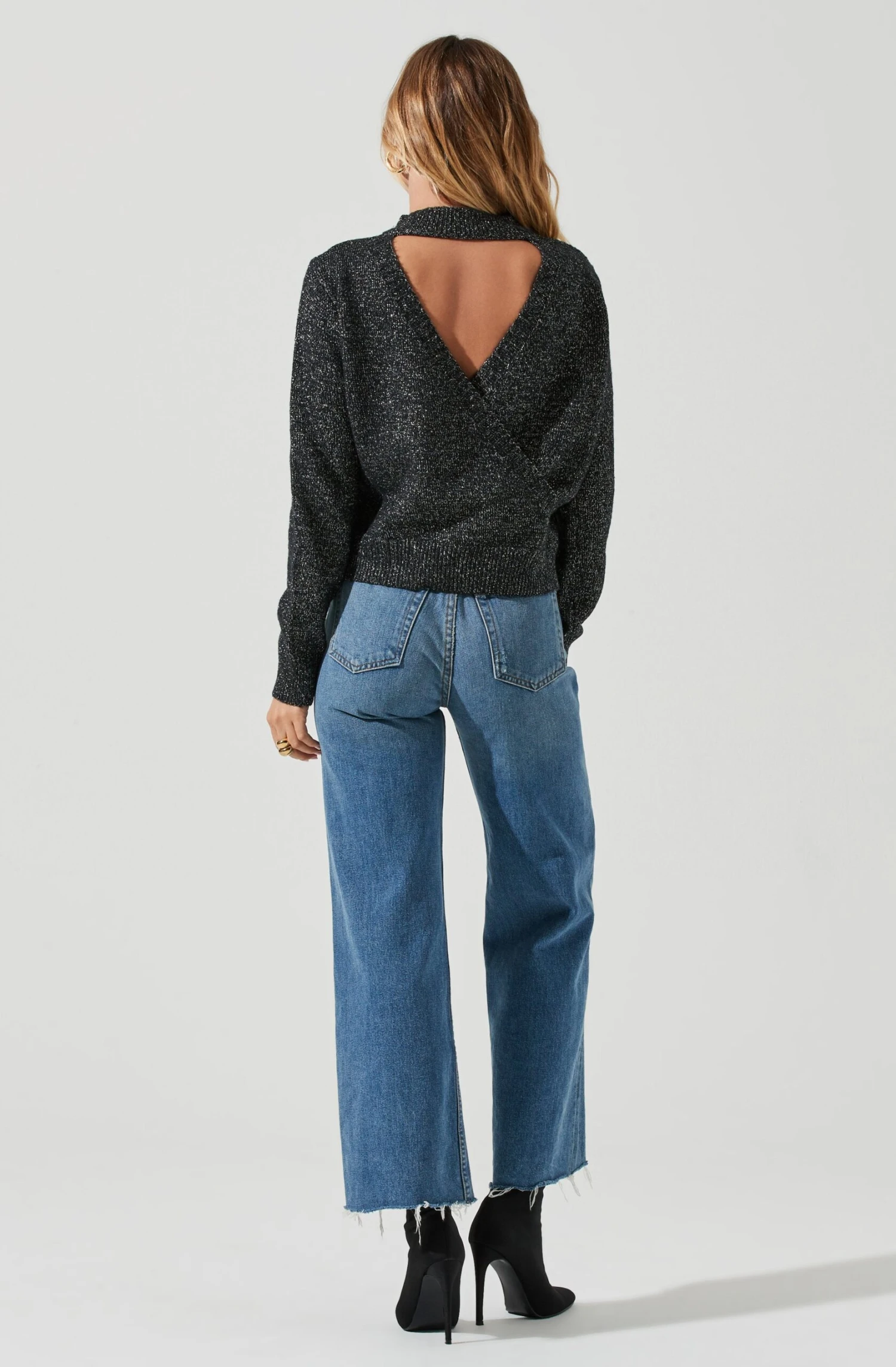 Chic and cozy is what it’s all about. The Arabella sweater features a mock neck collar with a relaxed fit and a metallic fabrication. Open back adds drama. Long sleeves.