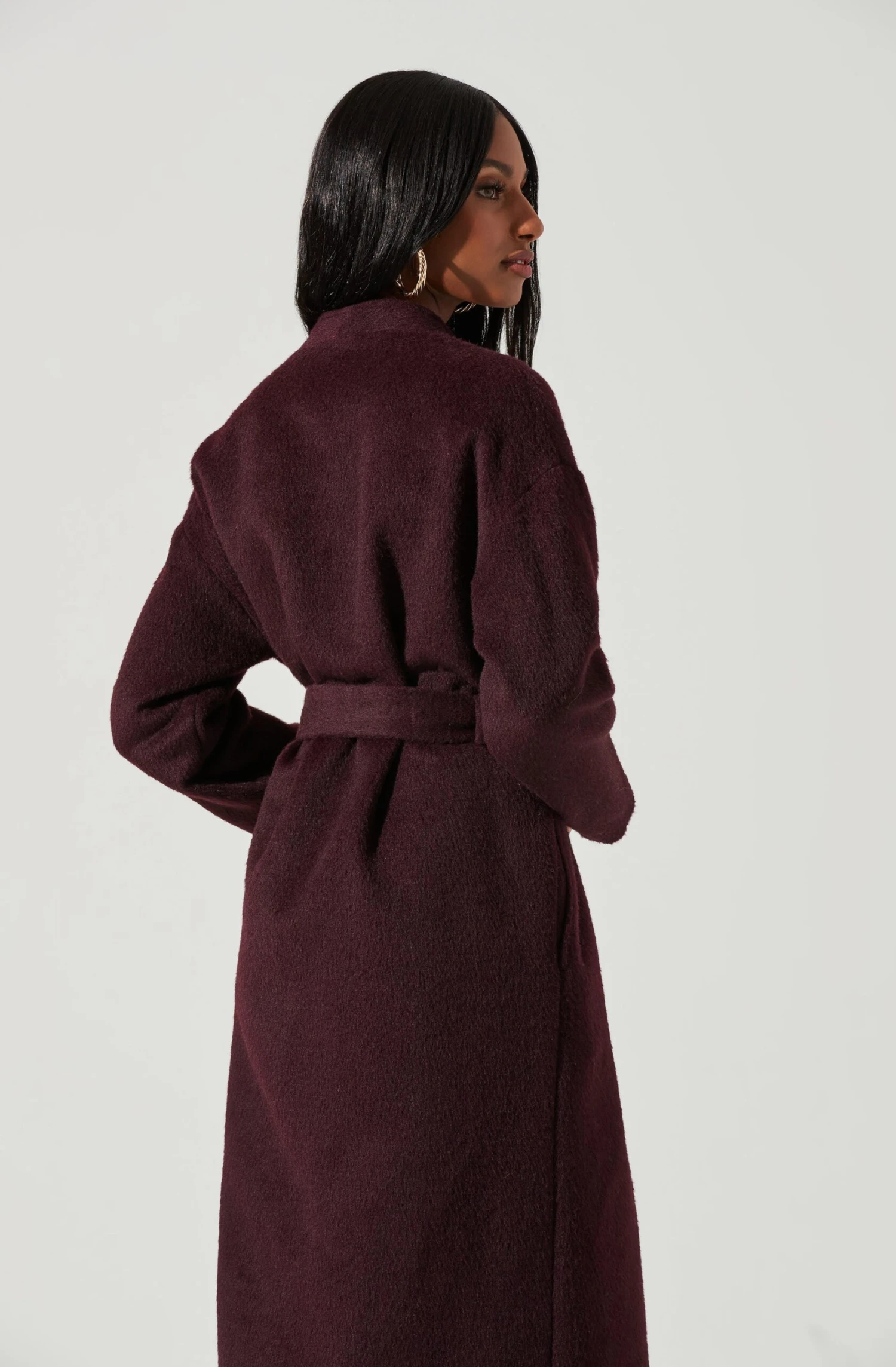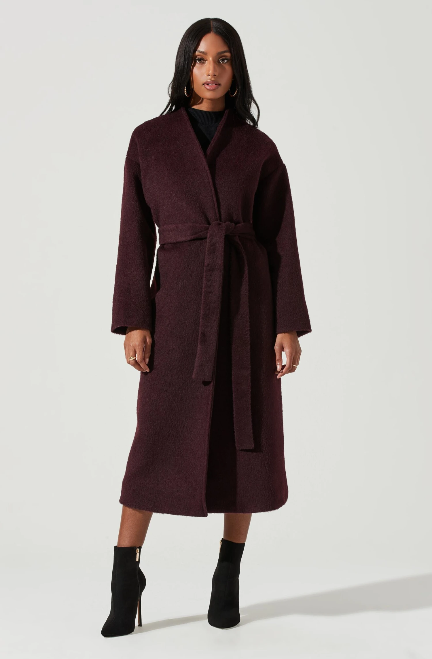 The Berkley Coat features a wool blend finish. Open front features a tying sash at the waist. Long sleeves. Side pockets.