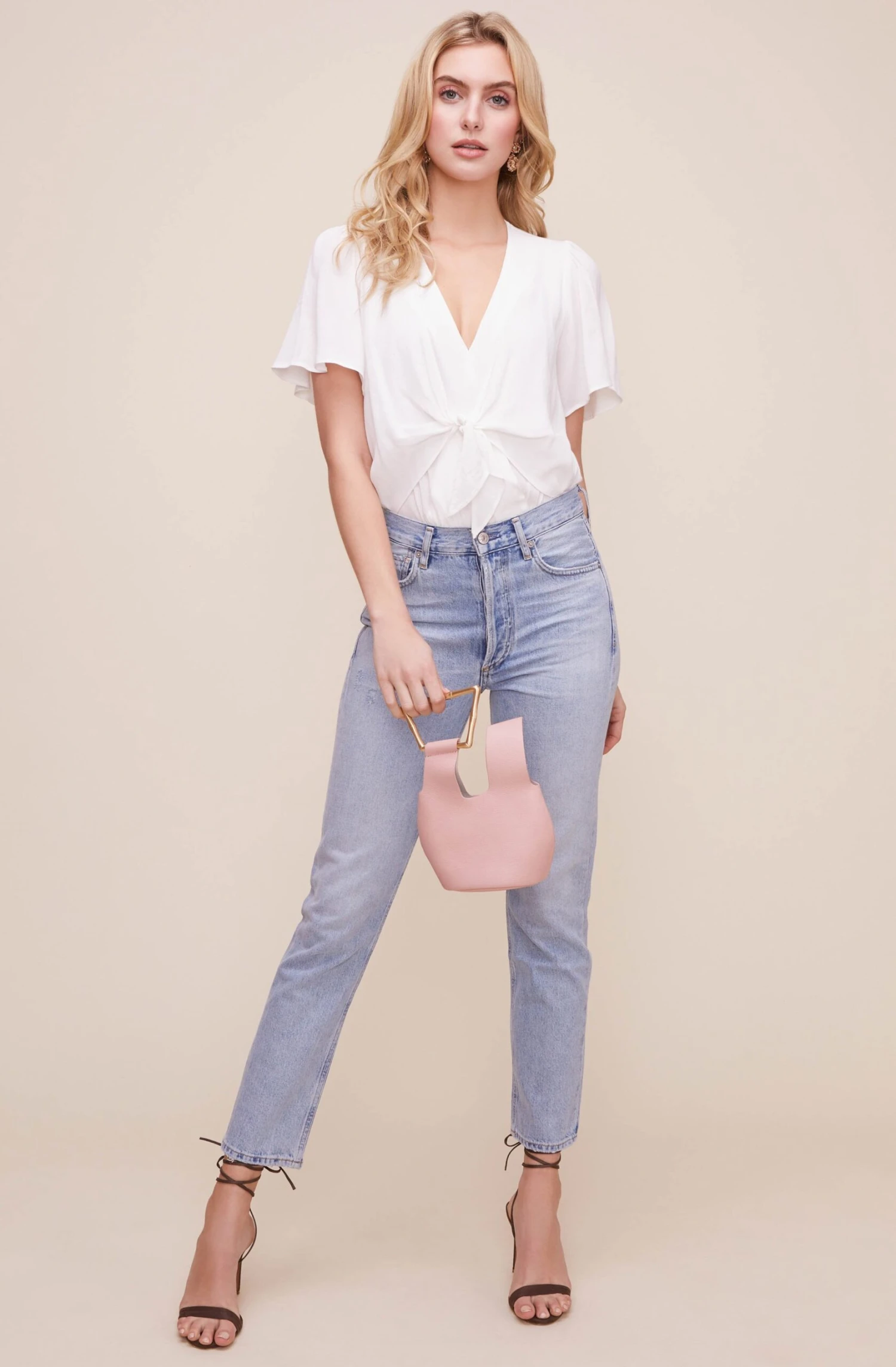 Put a twist to your wardrobe with the Cory Bodysuit! It features a deep V neckline that meets at a twist front. Short flutter sleeves and mesh bottoms.