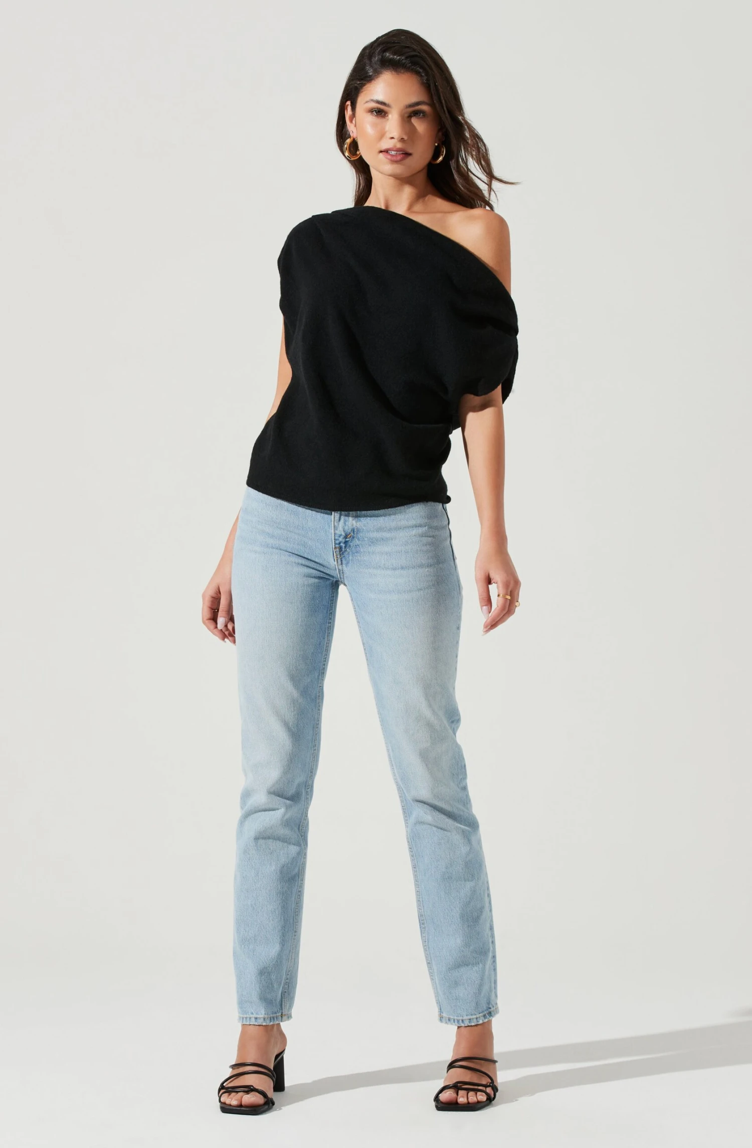 The Devin Sweater features a soft knit construction with a single shoulder neckline and draped silhouette.