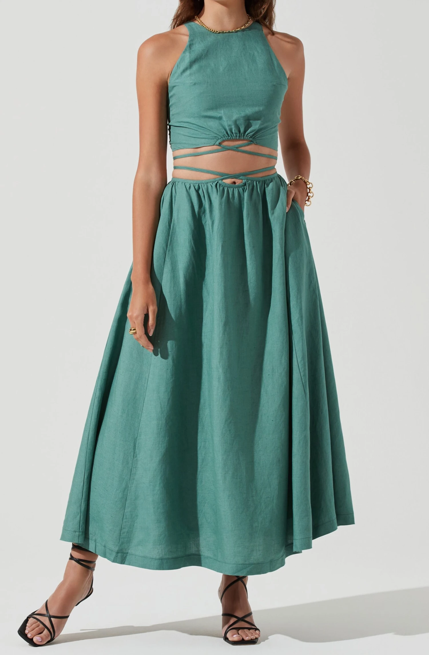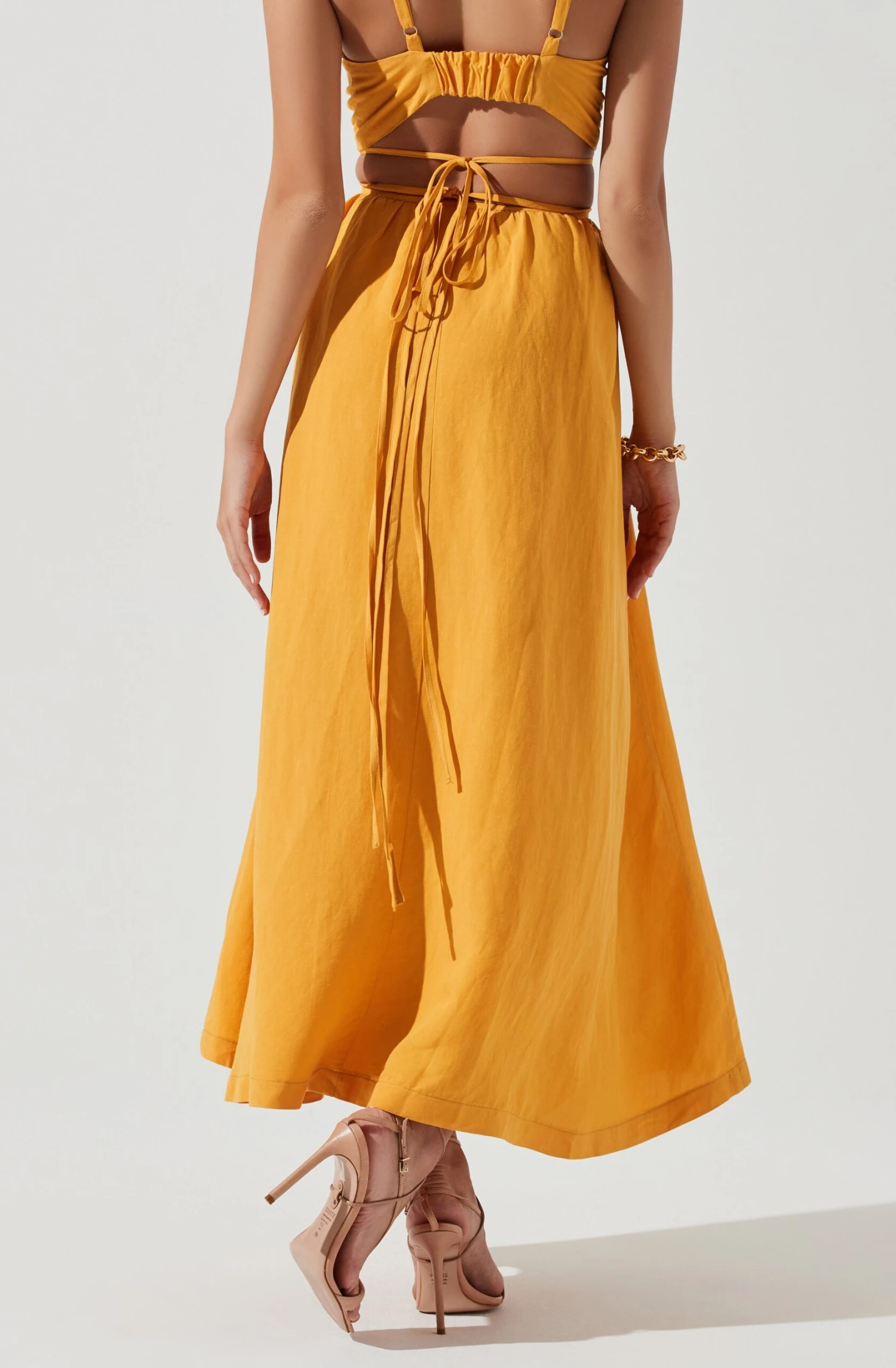 The Divine Skirt features a modern tie waist accent that leads to a full maxi-length silhouette and functional pockets at the hips. Concealed back zip closure. Fully lined.