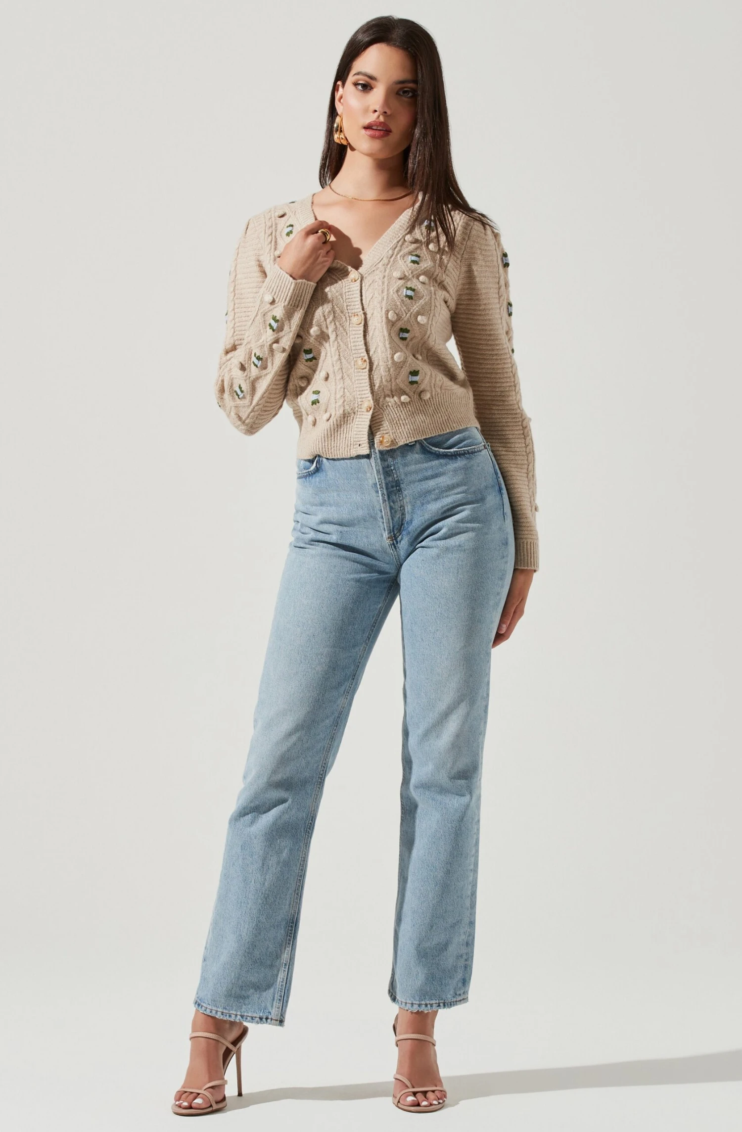 Cozy up in a cardigan. It features a V neckline that leads to a buttoned front. Cable knit design adds textures to the embroidered flower and pom accents throughout. Long sleeves.