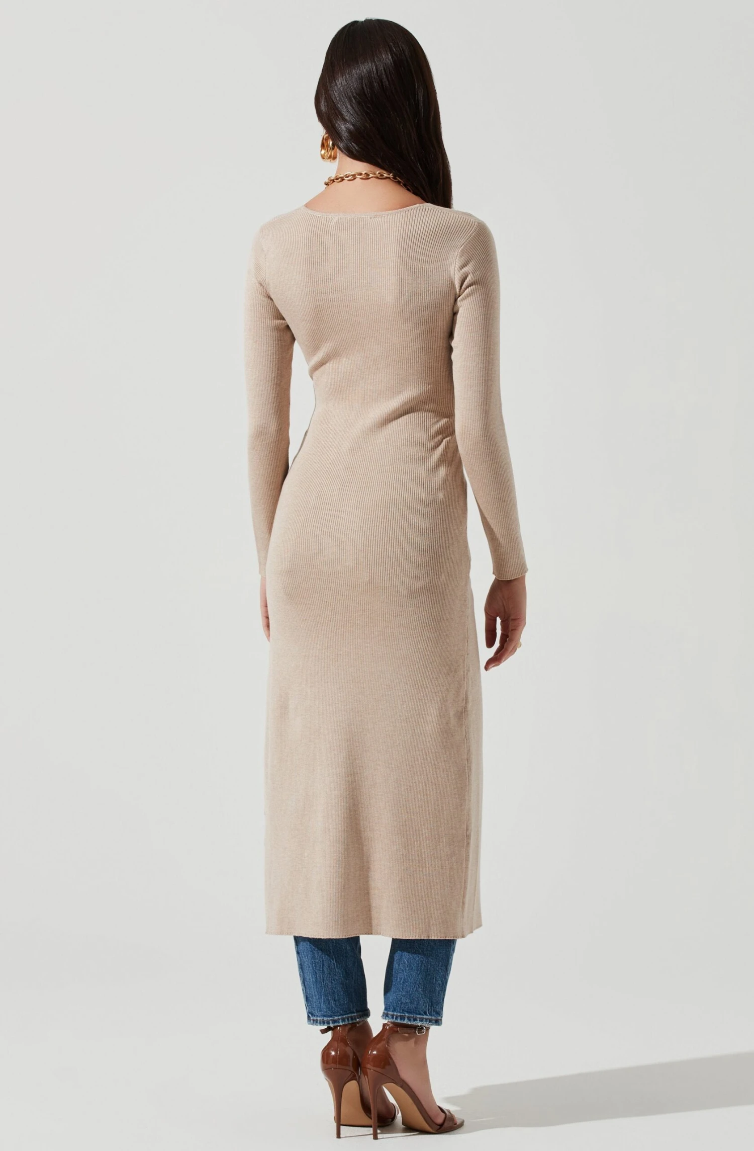 This ribbed knit sweater features a V neckline that leads to a wrapped front and high slit accent on the side. Long sleeves. Midi-length.