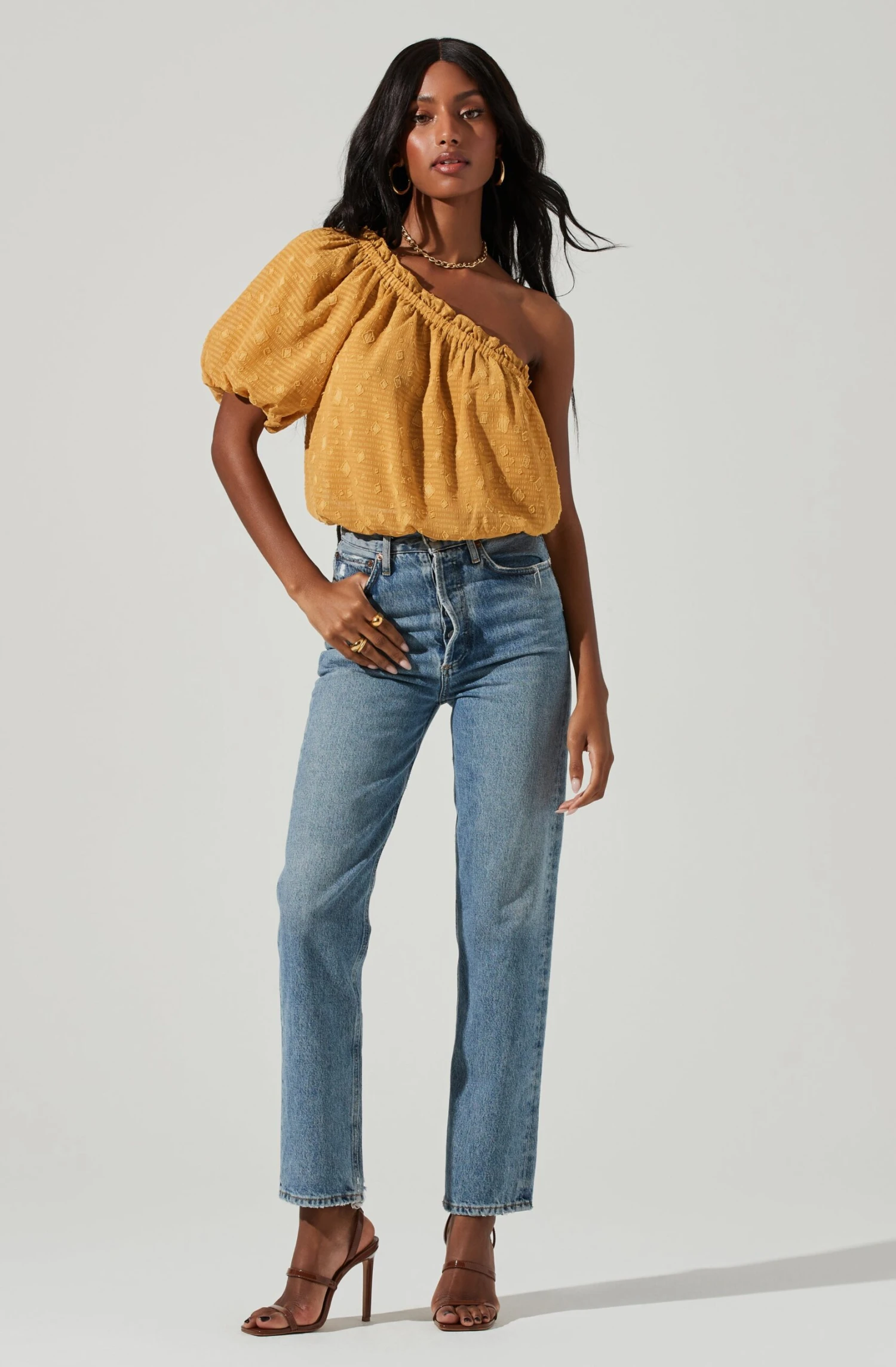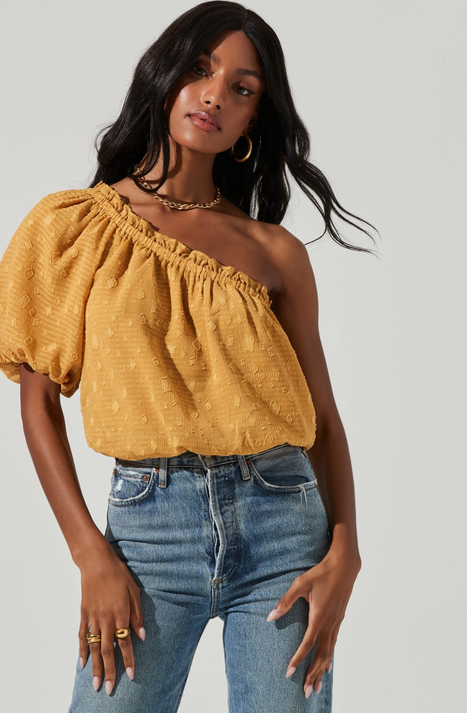 This statement top features a one-shoulder silhouette with a short puff sleeves. Elasticized neckline leads to a relaxed bodice and elastic waist.