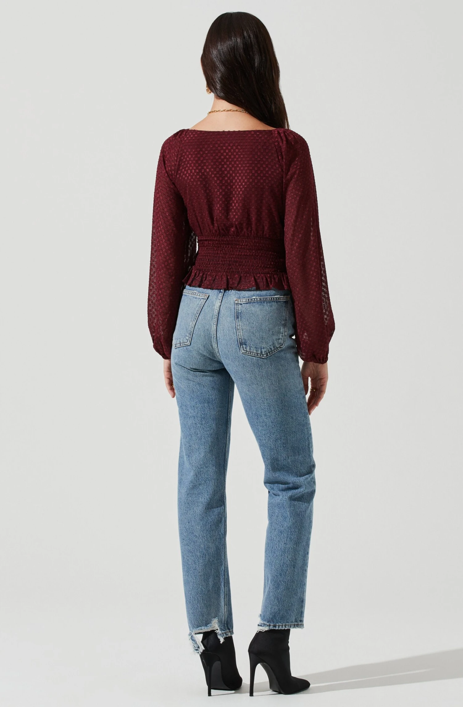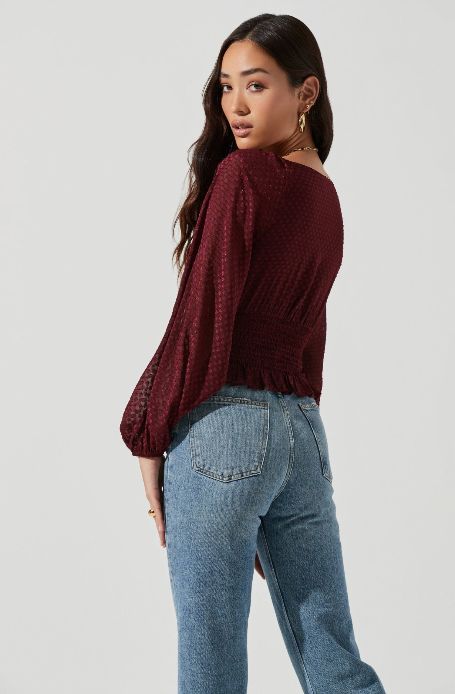 This dressy top features a burnout swiss dot design throughout with a V neckline, smocked bodice and long balloon sleeves. Ruffle hem.