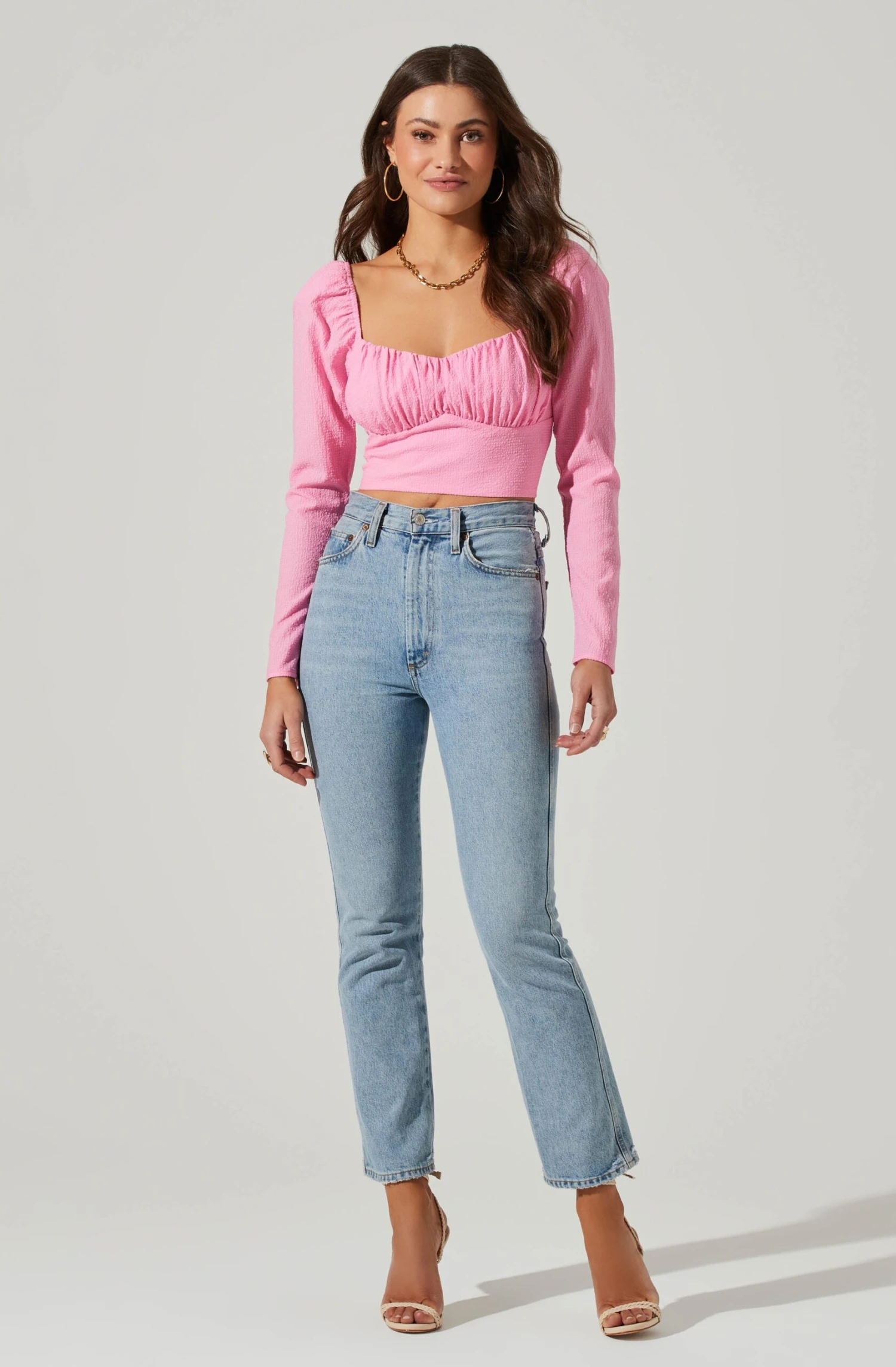 This textured top features a sweetheart neckline that leads to a ruched bust. Cropped hem. Long puff sleeves. Smocked back.