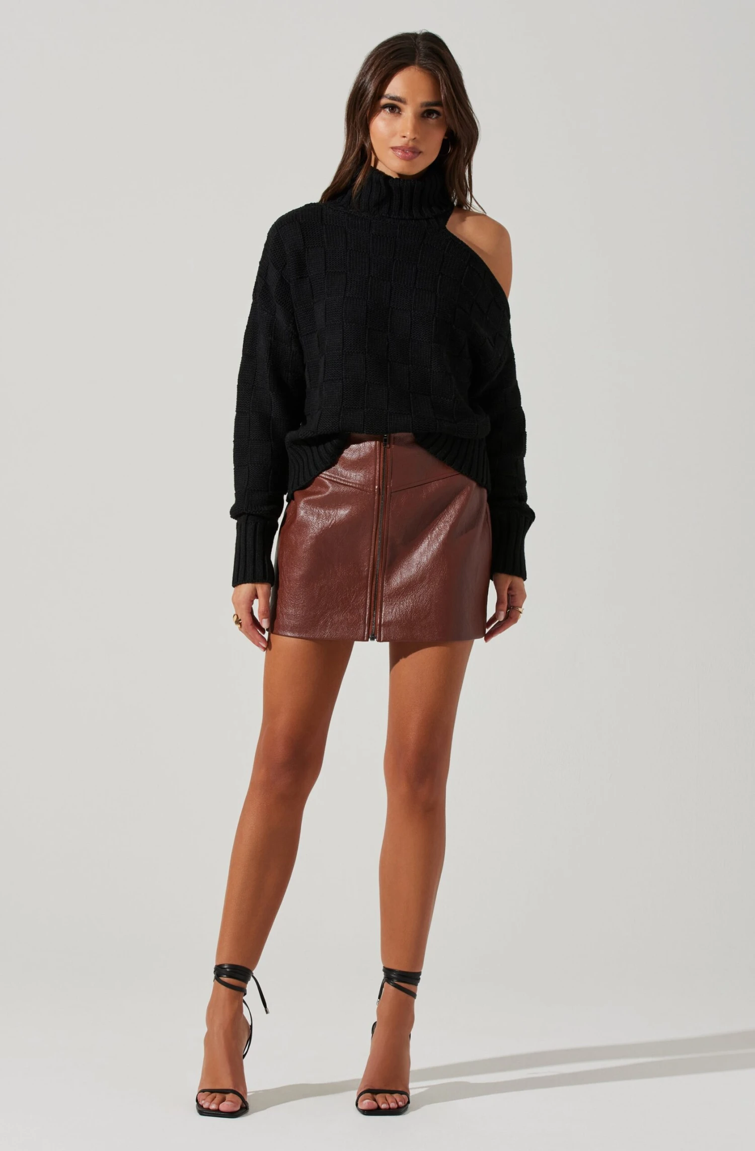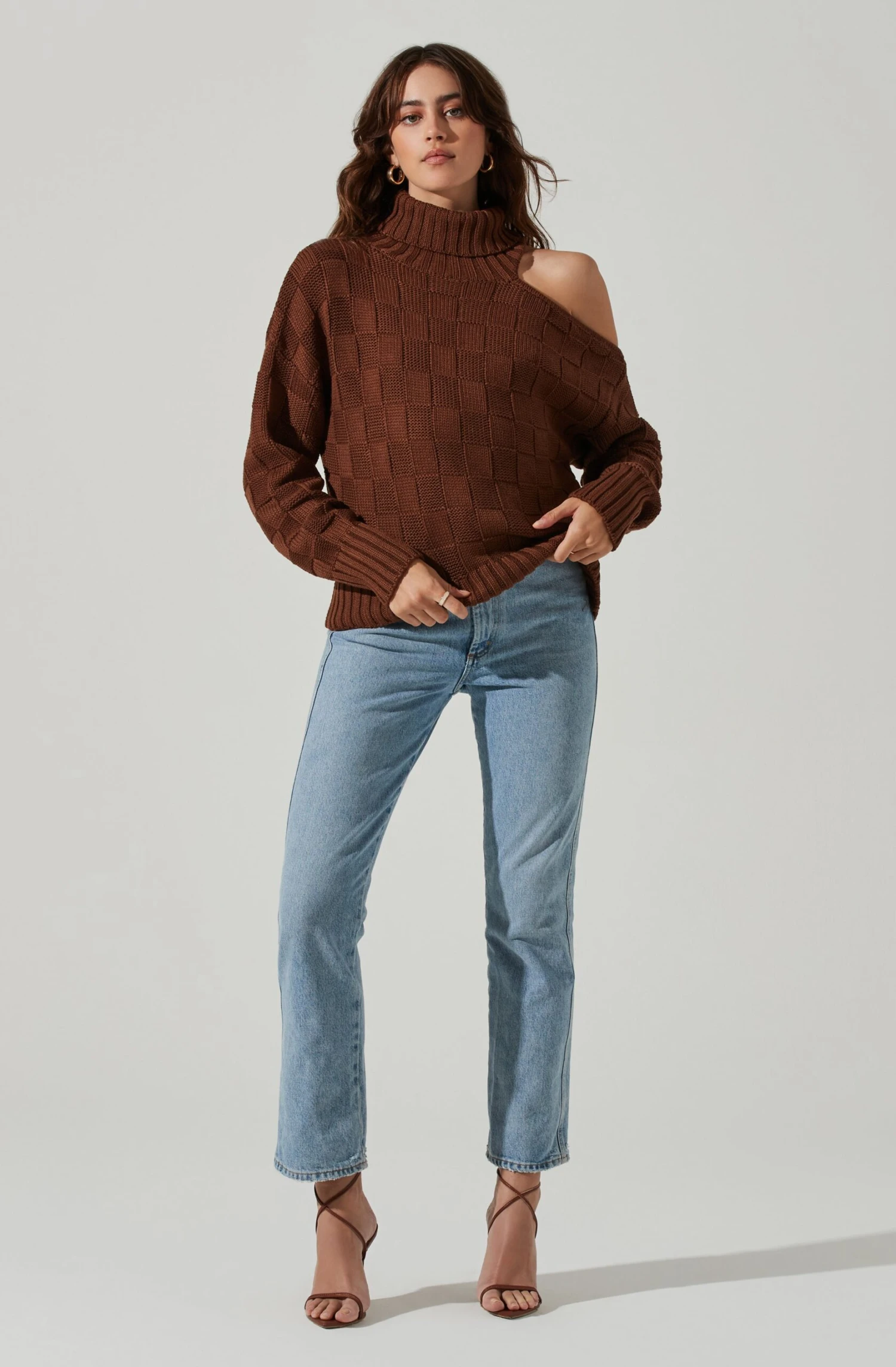Get cozy in this cable knit sweater. It features a mock neck collar that leads to a single shoulder cutout accent. Long sleeves.