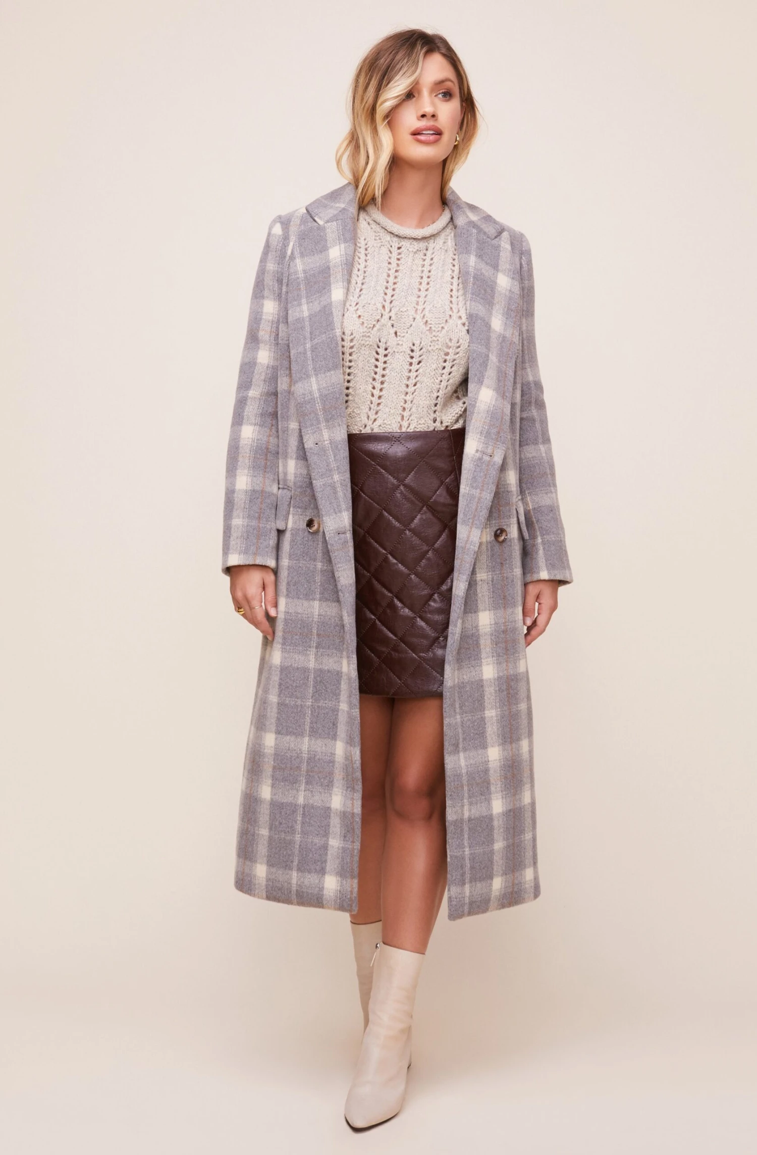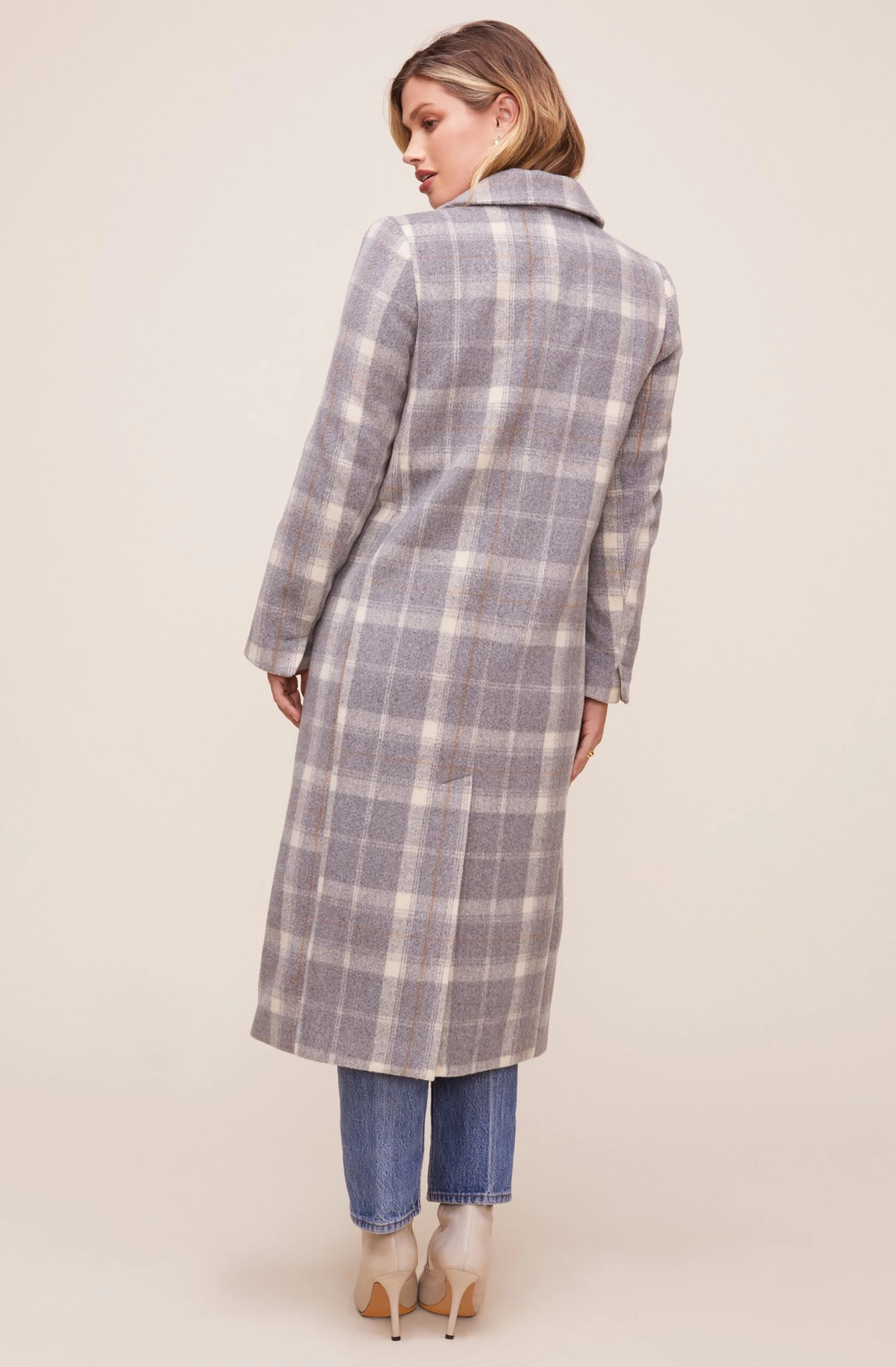 Fall weather calls for the perfect coat! The Raquel features a gorgeous plaid print throughout. Notched collar leads to a double breasted front, side flap pockets and long sleeves.