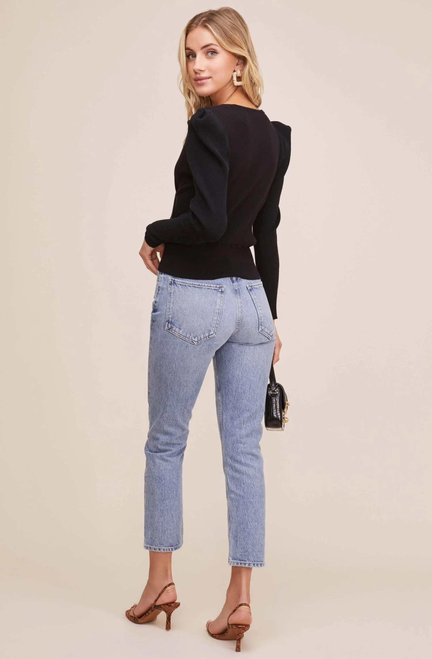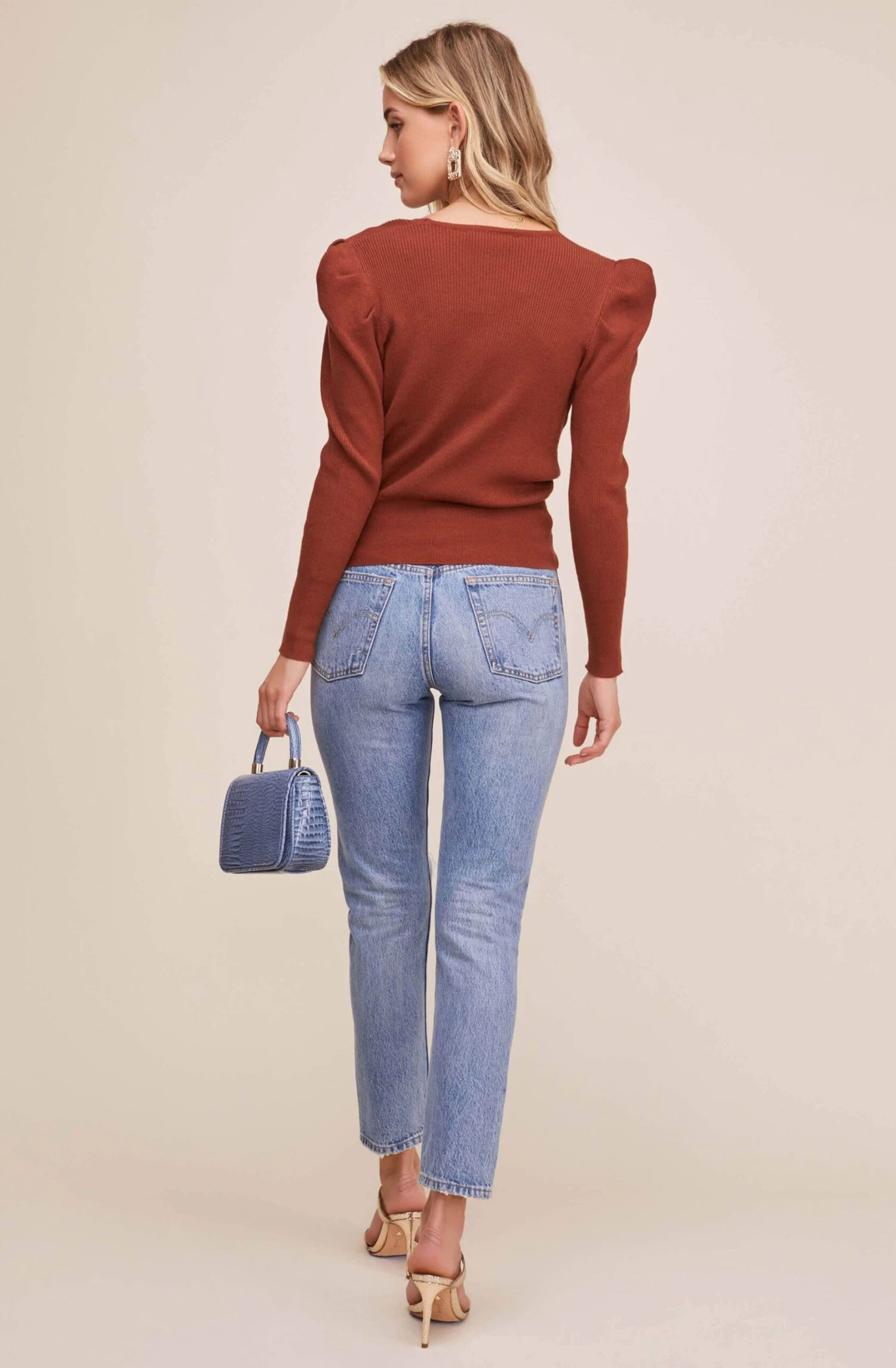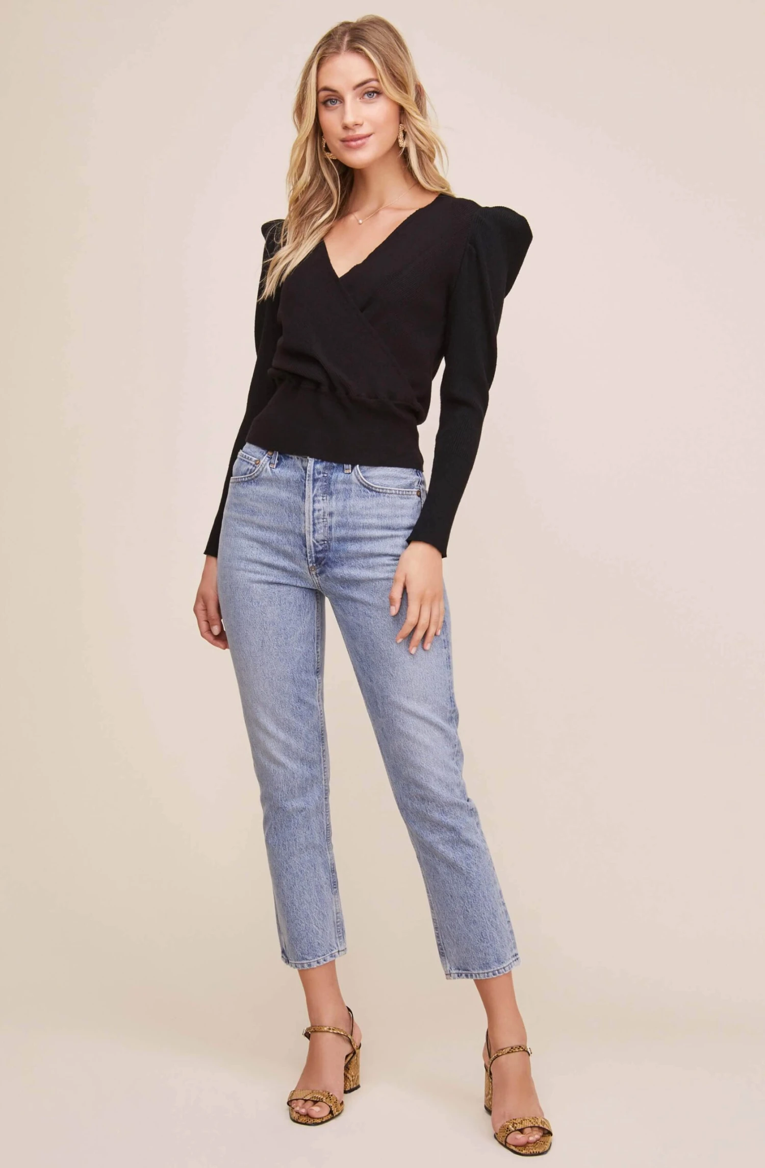 This ribbed knit sweater gets a dose of glam. With an elegant V neckline that leads to a wrapped front and defined waist, this sweater is perfect for adding some flair to your everyday look. Long sleeves with exaggerated puff shoulders.