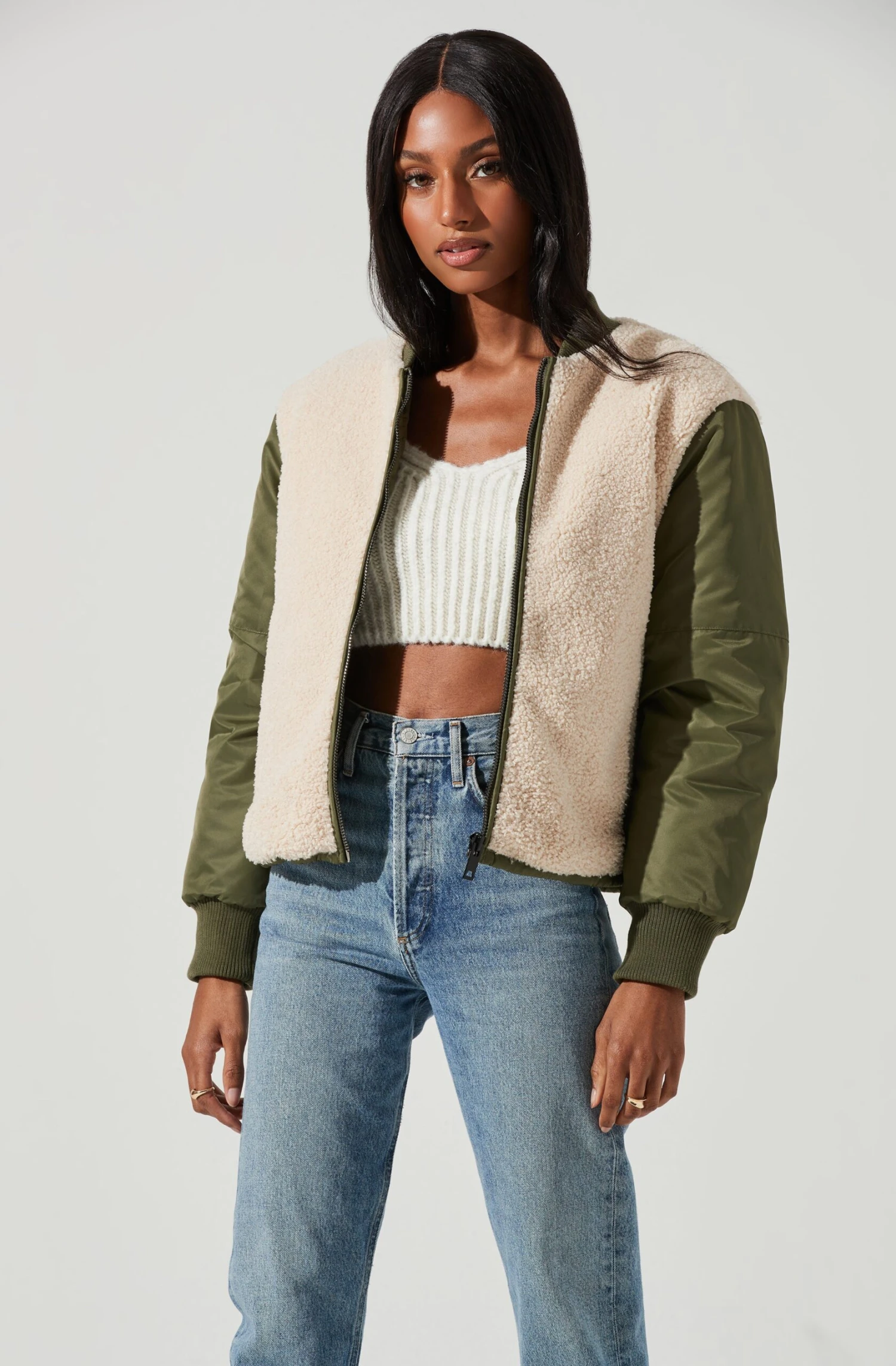 The Tegan Jacket features a faux shearling bodice with contrast puffer sleeves and ribbed knit cuffs. Zippered front. Slanted side pockets.
