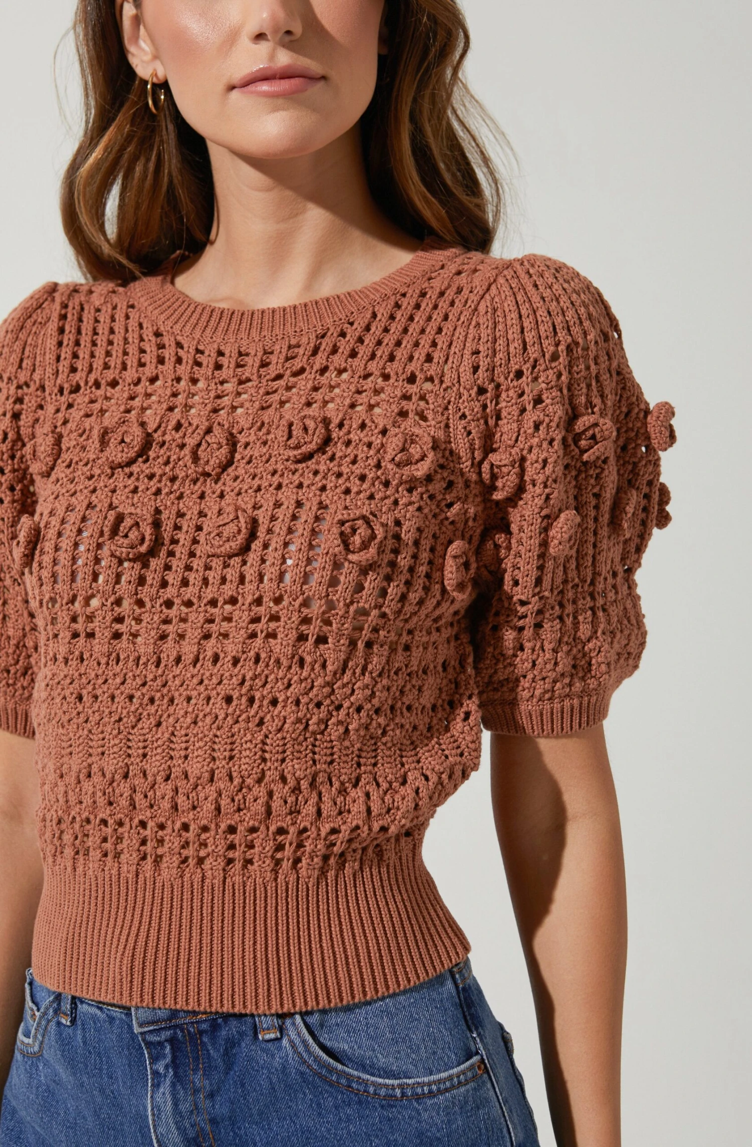 The Winslow sweater features a crew neckline that leads to a relaxed silhouette and cinched waist. Floral embroidery throughout. Short sleeves.
